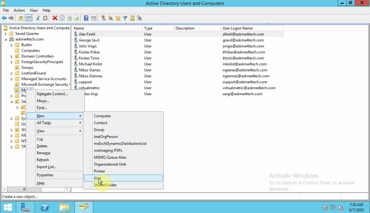 • Right click in the OU that you want to create the user and select New - - User