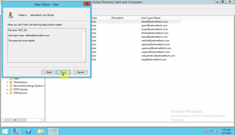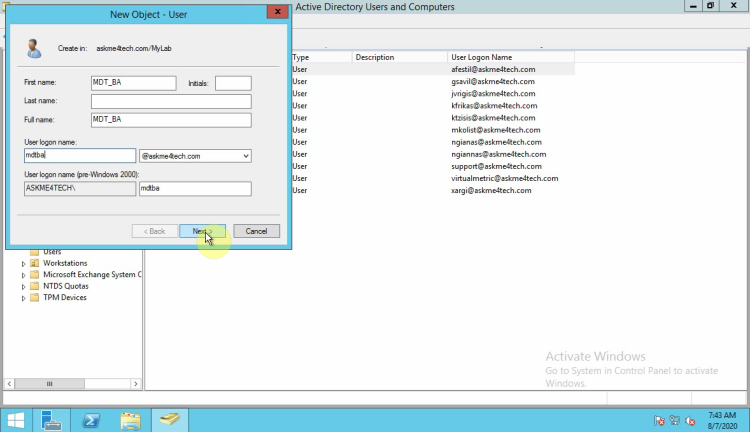 • Type the name that you want to give. I prefer to give a name like MDT_BA but this is your choice which name you will give in the user.