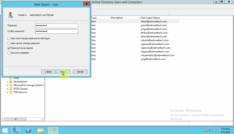 • Uncheck the User must change password at next logon.