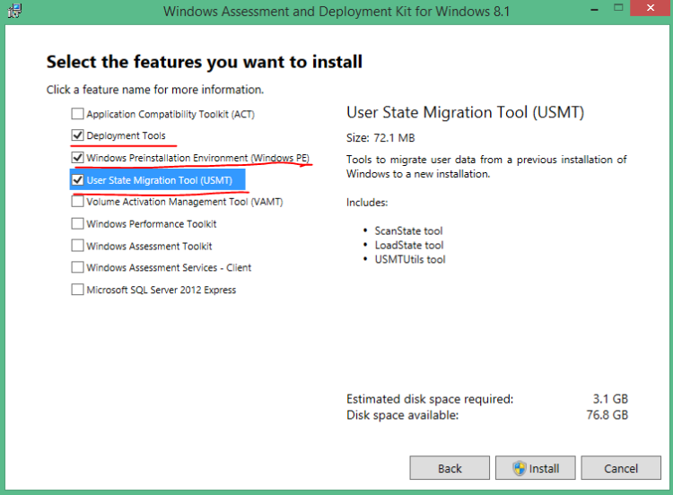 • Check only Deployment Tools, Windows Preinstallation Enviroment(PE) and User State Migration Tool(USMT) and click Install.
