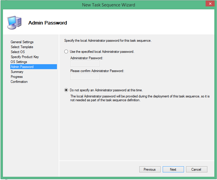 • Specify the local Admin Password if you want or select Don't specify an Administrator password at this Time