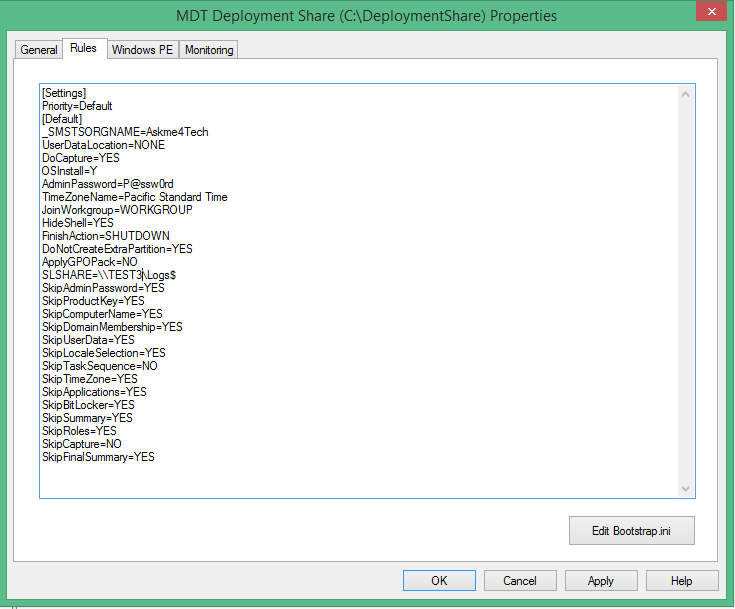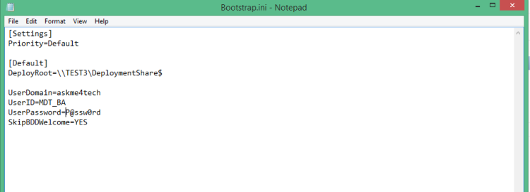 Settings] Priority=Default [Default] DeployRoot=\\TEST3\MDTBuildLab$ UserDomain=askme4tech UserID=MDT_BA UserPassword=P@ssw0rd SkipBDDWelcome=YES