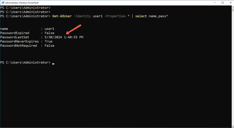 In this case you can use the following command to list the Date/Time that the user password was changed. I used the select name,pass* to list only the relative results.
