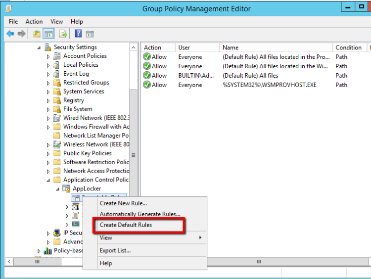 • Right-click in the Script Rules and select Create Default Rules. This step is crucial because it allows the Scripts to run from %Program files% and Windows folders. Windows and Program files folders are running system scripts. If you don’t create the Default Rules then you will break operations in Windows. Servers and Workstations to which the Rule will be applied without the Default Rules will not work as expected.