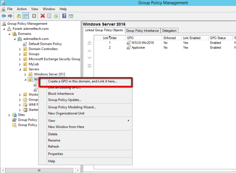• Right click in the Organization Until that you want to create the AppLocker Policy and select Create a GPO in this Domain and link it here.