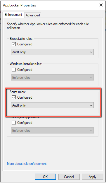 • In the Script Rules check the Configured and change to Audit Only. Click OK.