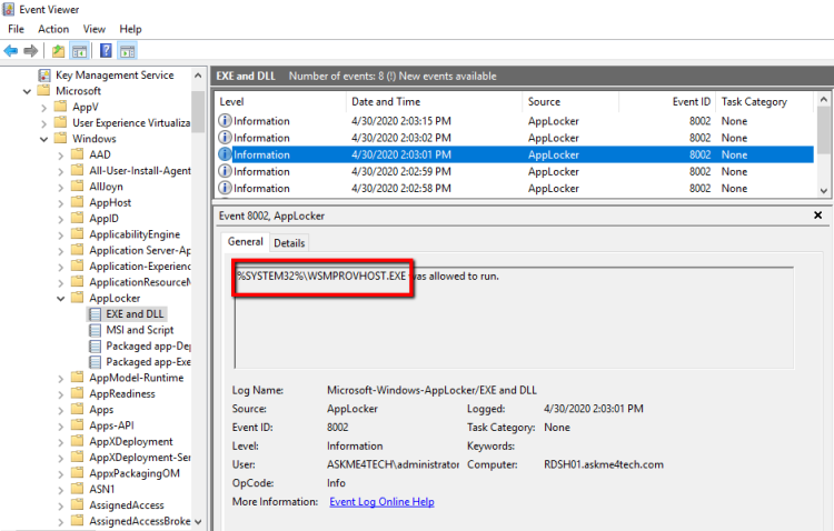 • Open the Event Viewer in the Server or Workstation that run the Applocker and copy/paste the Path from the Logs.