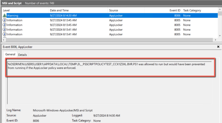 • The script is running. However, let’s go into the Event Viewer to see what we have in Logs from AppLocker. Don’t forget that we are still running in Audit Mode. The only Warning that we have is that the \__PSSCRIPTPOLICYTEST_CCX1Z3XL.BVR.PS1 was allowed to run but would have been prevented from running if the AppLocker policy had been enforced.