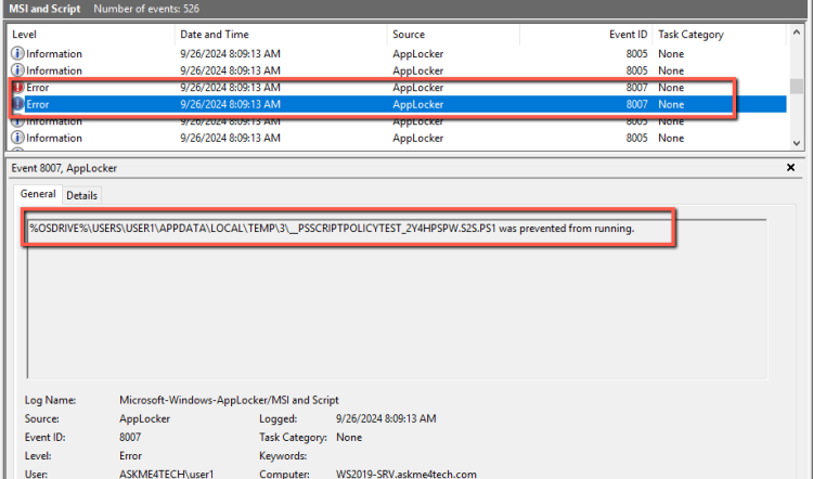 We will see in the Event Logs only Logs that AppLocker blocking the PSSCRIPTPOLICYTEST which trying to determine in what LanguageMode the script wants to run.
